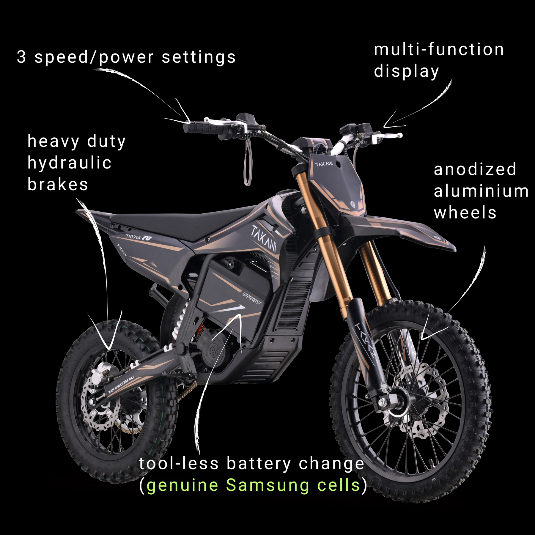Introducing the all-new TAKANI TK1714-70, our latest-generation electric dirt bike built for riders ready to step into higher performance. With aggressive, modern styling and serious engineering behind it, the TK1714-70 represents the next level in the TAKANI range.